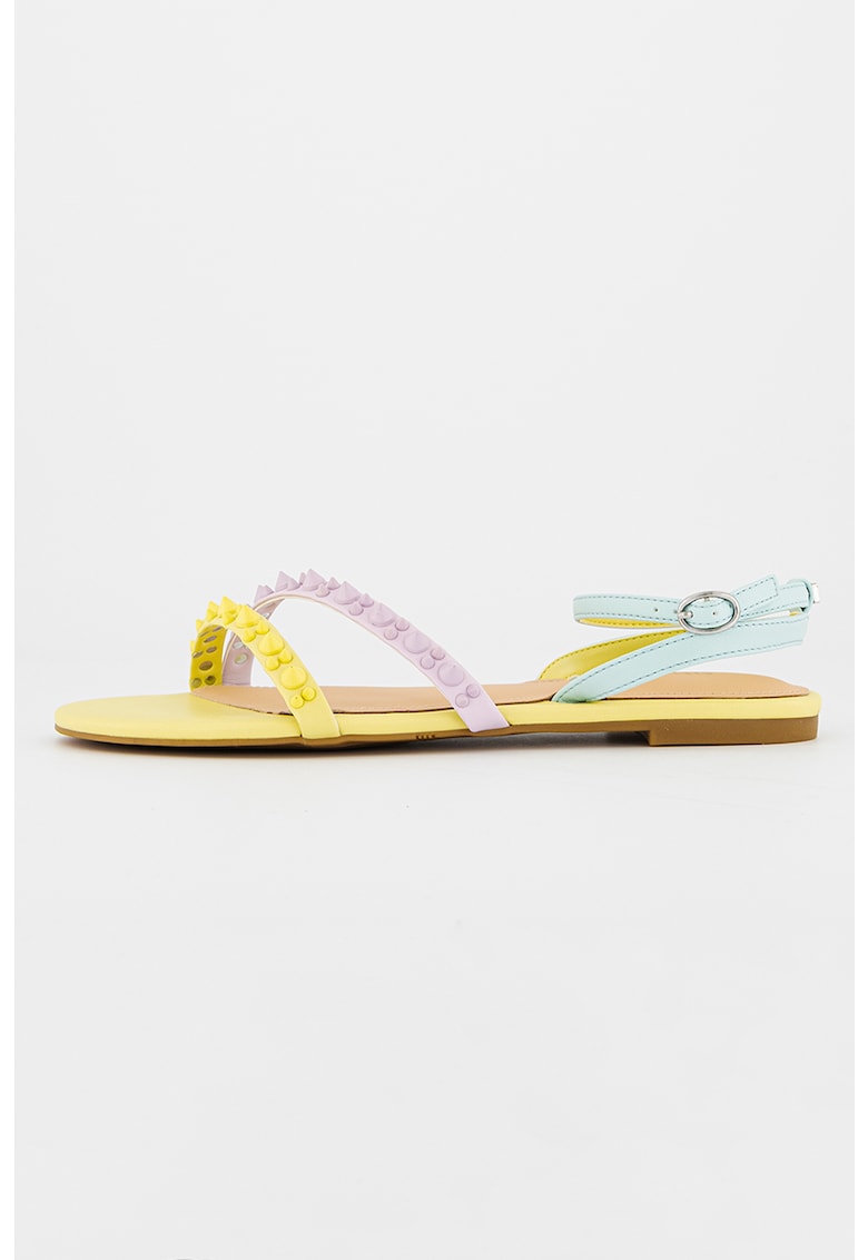 Caracteristici Tip: cu talpa joasa Culoare: lila – verde menta – verde fistic Material: piele ecologica Imprimeu: uni Stil: casual Tip talpa: plata Culoare elemente metalice: argintiu Detalii: aplicatii cu tinte Sistem inchidere: catarama Compozitie Partea superioara: alte materiale Material interior: alte materiale Material talpa: alte materiale