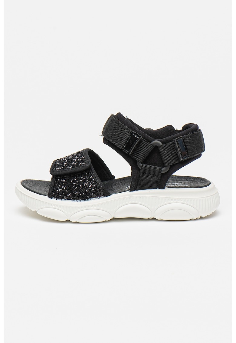 Caracteristici Culoare: negru Imprimeu: uni Material: textil – sintetic Sistem inchidere: velcro Tip talpa: plata Detalii: particule stralucitoare Compozitie Partea superioara: material textil – material sintetic Material interior: piele – textil Material talpa: alte materiale