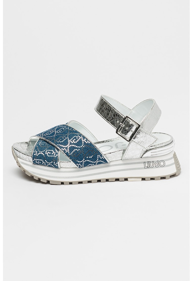 Caracteristici Tip: cu platforma Culoare: albastru prafuit – alb optic – argintiu Material: textil – sintetic Imprimeu: logo Stil: casual Varf: rotund Tip talpa: wedge Culoare elemente metalice: argintiu Sistem inchidere: catarama Compozitie Partea superioara: textil – alte materiale Material interior: alte materiale Material talpa: alte materiale
