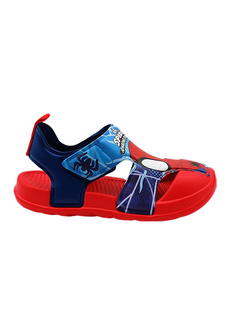 Caracteristici Culoare: rosu – bleumarin Imprimeu: grafic Material: sintetic Poveste/Personaj: spider-man Sistem inchidere: velcro Tip talpa: plata Compozitie Partea superioara: alte materiale Material interior: textil Material talpa: alte materiale