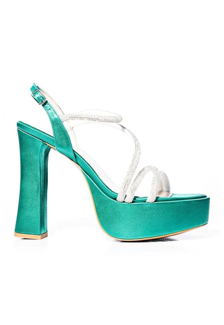 Caracteristici Tip: cu toc Culoare: verde – argintiu Material: satin Imprimeu: uni Stil: elegant Tip toc: masiv Culoare elemente metalice: argintiu Sistem inchidere: catarama Compozitie Partea superioara: textil Material interior: alte materiale Material talpa: alte materiale Dimensiuni Inaltime toc: 13 cm