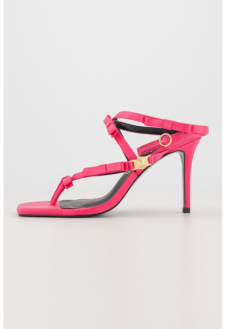 Caracteristici Tip: cu toc Culoare: fucsia Material: piele ecologica Imprimeu: uni Stil: elegant Tip toc: stiletto Culoare elemente metalice: auriu Detalii: aplicatii cu funda Sistem inchidere: catarama Compozitie Partea superioara: piele ecologica Material interior: „piele & sintetic” Material talpa: alte materiale Dimensiuni Inaltime toc: 8.5 cm
