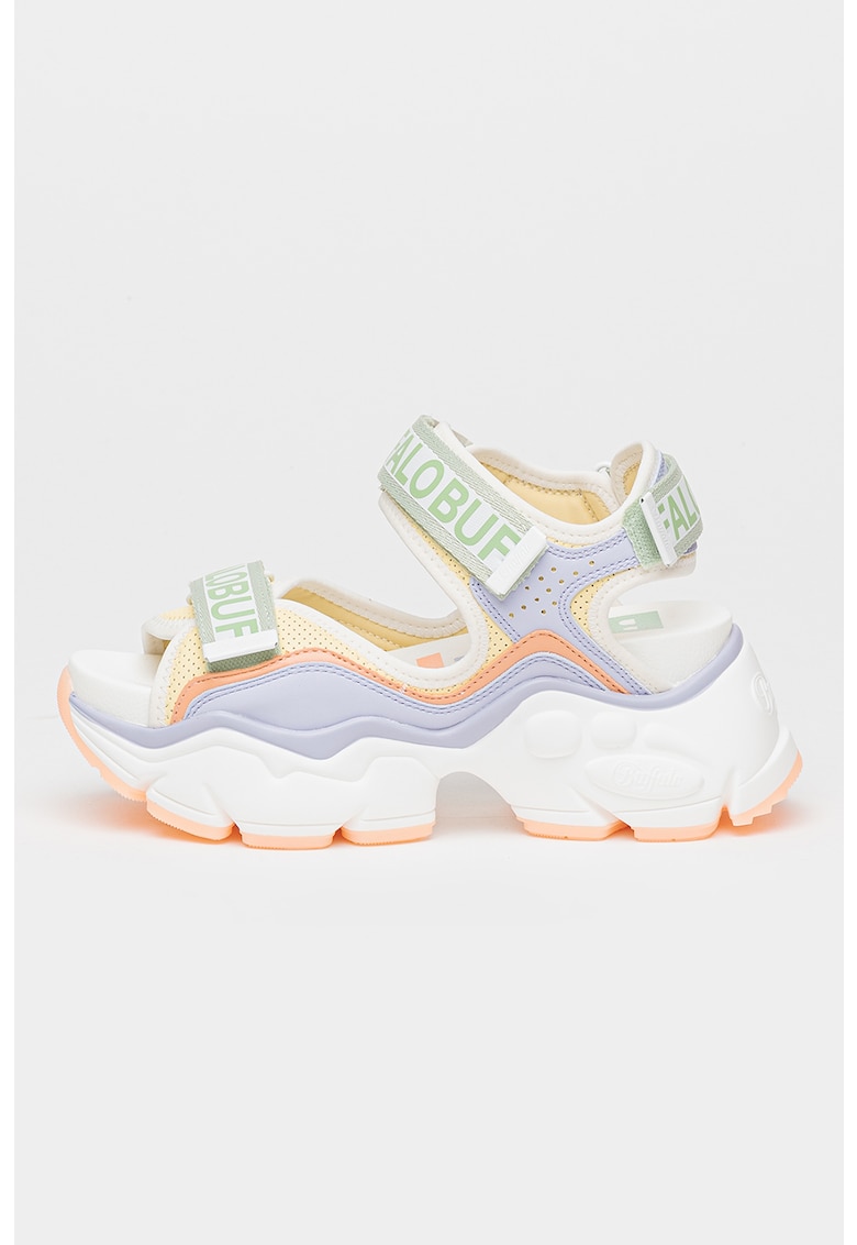 Caracteristici Tip: cu platforma Culoare: alb – galben – lila Material: textil – piele ecologica Stil: casual Tip talpa: flatform Detalii: aspect perforat – aspect masiv – aspect colorblock Sistem inchidere: velcro Compozitie Partea superioara: alte materiale – material textil Material interior: textil – alte materiale Material talpa: alte materiale Dimensiuni Platforma spate: 6 cm