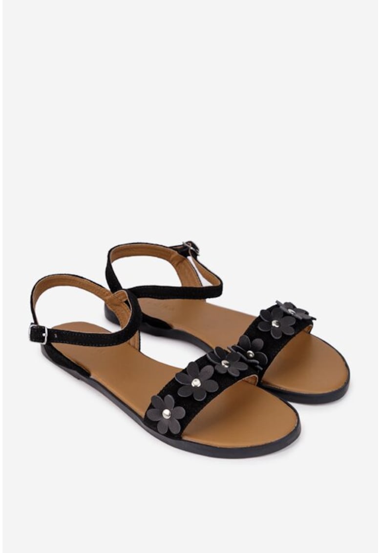 Sandale dama din piele intoarsa neagra cu ornament flori