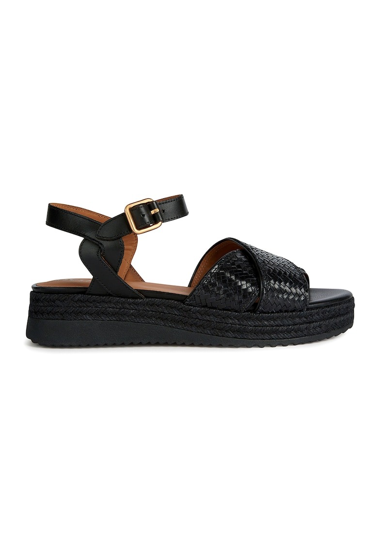 Caracteristici Tip: cu platforma Culoare: negru Material: piele naturala Imprimeu: uni Stil: casual Varf: rotund Tip talpa: wedge Tehnologie: geox respira® Culoare elemente metalice: auriu Detalii: aplicatii din iuta impletite Sistem inchidere: catarama Compozitie Partea superioara: piele Material interior: alte materiale – piele Material talpa: alte materiale Dimensiuni Platforma spate: 5 cm