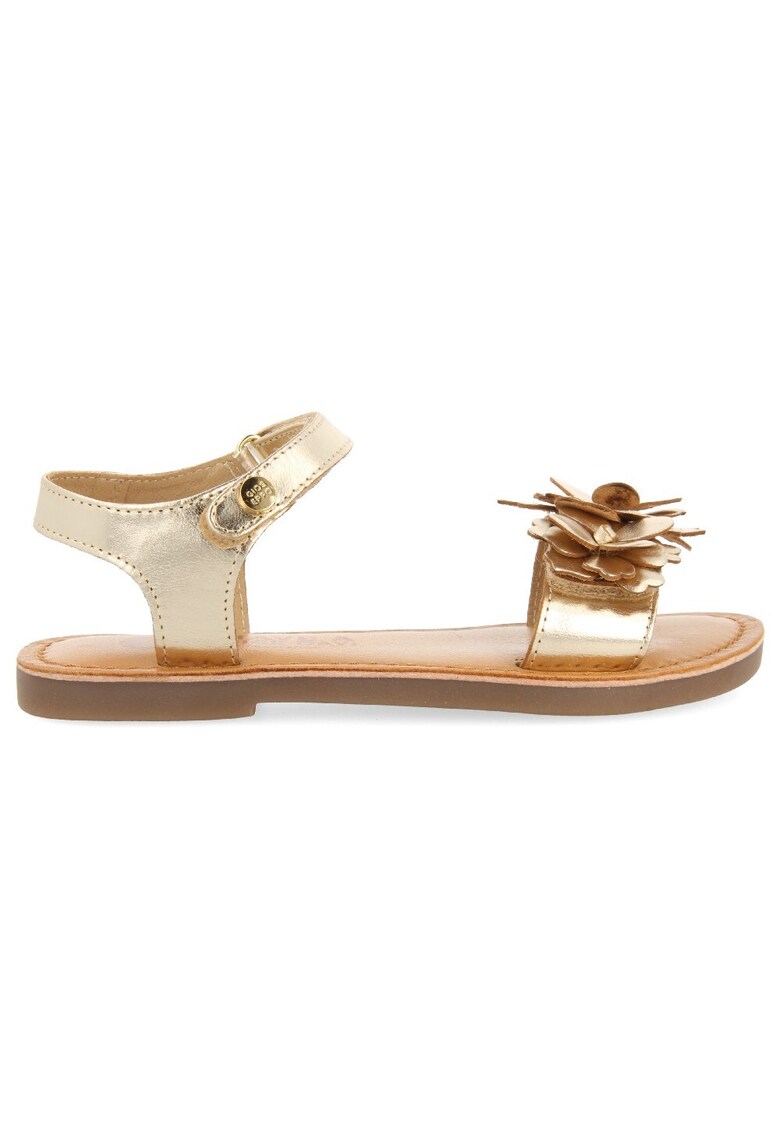 Caracteristici Culoare: auriu Imprimeu: uni Material: piele naturala Sistem inchidere: velcro Tip talpa: plata Detalii: aspect metalic – aplicatii florale Compozitie Partea superioara: piele Material interior: piele naturala Material talpa: alte materiale