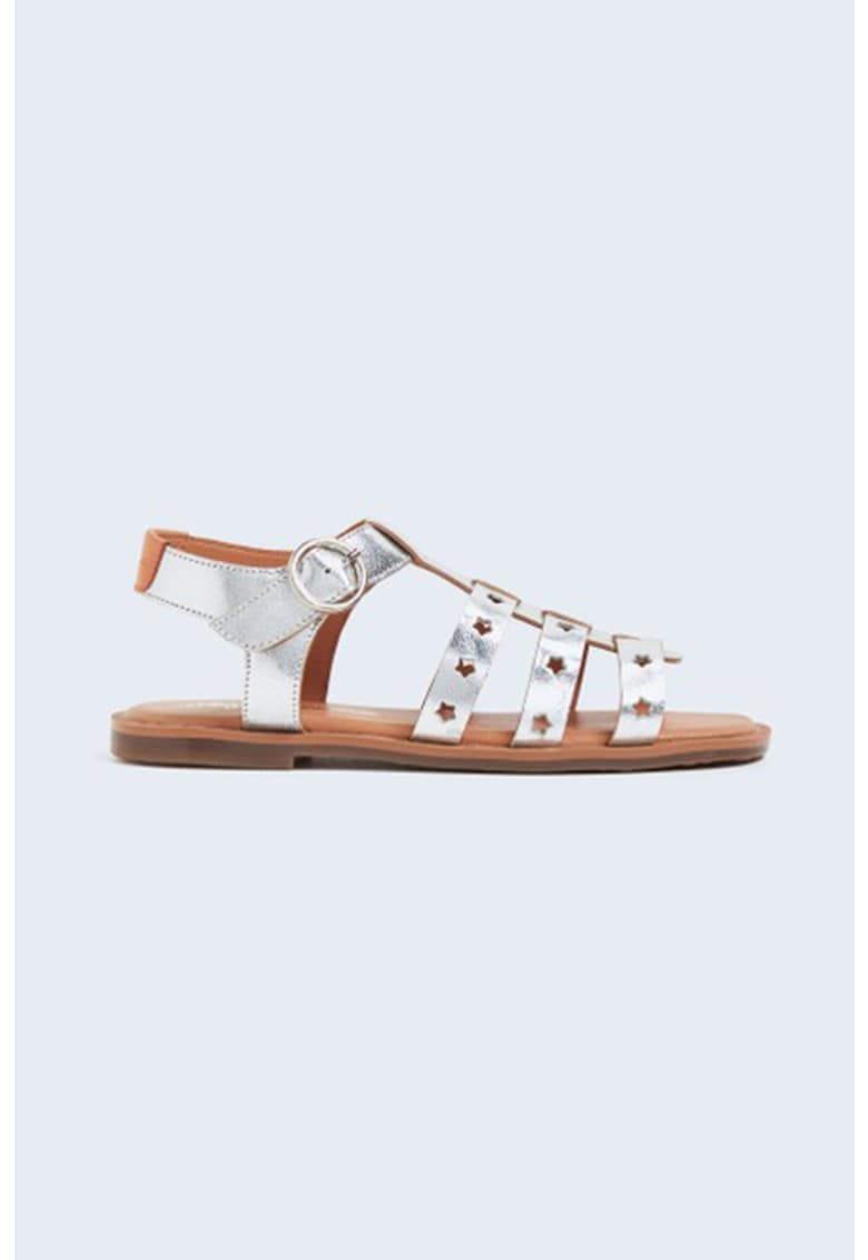 Caracteristici Culoare: alb – argintiu Stil: casual Imprimeu: uni Material: piele naturala Varf: deschis Sistem inchidere: velcro Tip talpa: plata Compozitie Partea superioara: piele Material interior: alte materiale Material talpa: alte materiale
