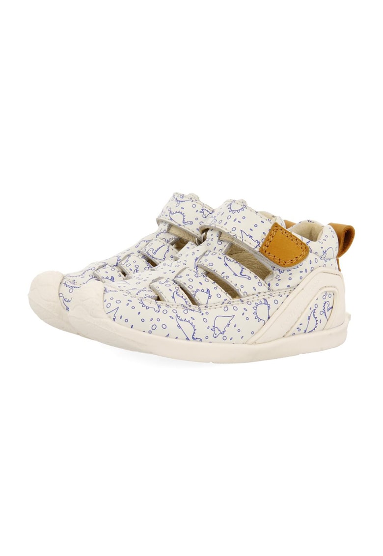 Caracteristici Culoare: alb – indigo Imprimeu: grafic Material: piele naturala Sistem inchidere: velcro Tip talpa: plata Compozitie Partea superioara: piele Material interior: piele naturala Material talpa: alte materiale