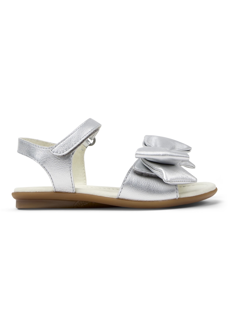 Caracteristici Culoare: argintiu Imprimeu: uni Material: piele naturala Sistem inchidere: velcro Tip talpa: plata Detalii: funde Compozitie Partea superioara: piele Material interior: piele Material talpa: alte materiale