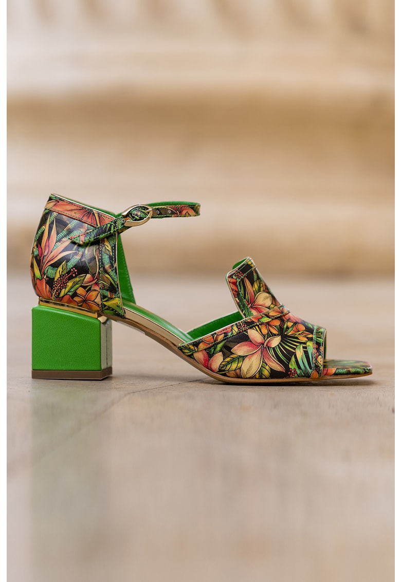 Caracteristici Tip: cu toc Culoare: verde – negru – portocaliu Material: piele naturala Imprimeu: cu model Stil: elegant Tip toc: masiv Sistem inchidere: catarama Compozitie Partea superioara: piele Material interior: piele Material talpa: alte materiale Dimensiuni Inaltime toc: 5 cm