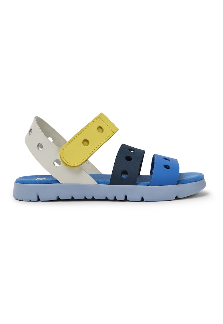 Caracteristici Culoare: galben – alb murdar – albastru Stil: casual Imprimeu: uni Material: piele naturala Varf: deschis Sistem inchidere: velcro Tip talpa: plata Detalii: design perforat Compozitie Partea superioara: piele de vaca Material interior: piele – material textil Material talpa: alte materiale