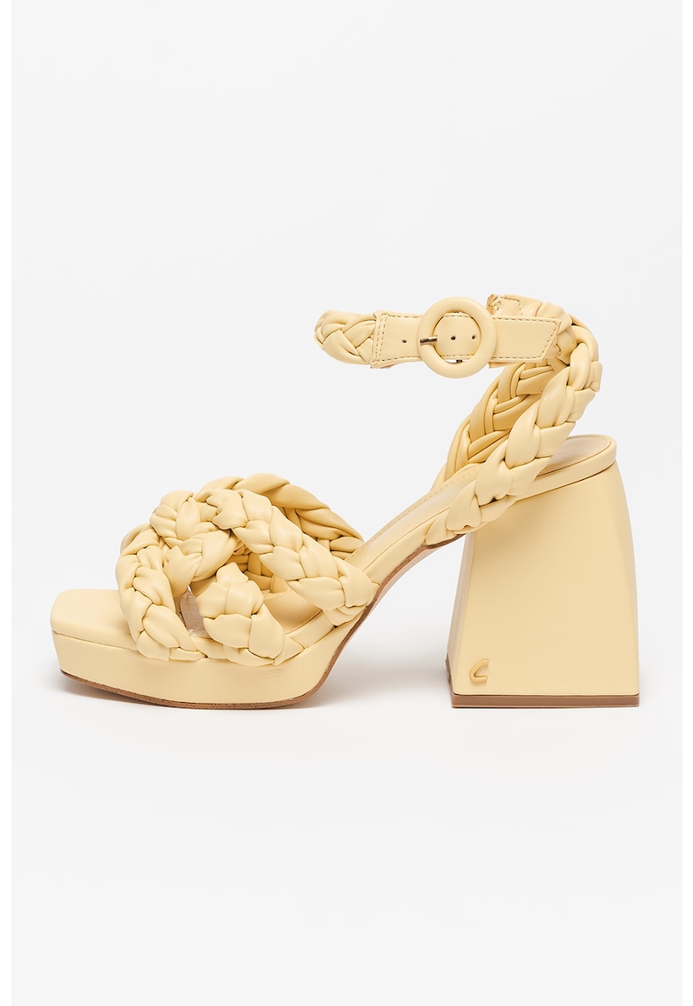 Caracteristici Tip: cu toc Culoare: galben pai Material: piele ecologica Imprimeu: uni Stil: casual Tip toc: masiv Detalii: aspect impletit Sistem inchidere: catarama Compozitie Partea superioara: alte materiale Material interior: alte materiale Material talpa: alte materiale Dimensiuni Inaltime toc: 9.4 cm