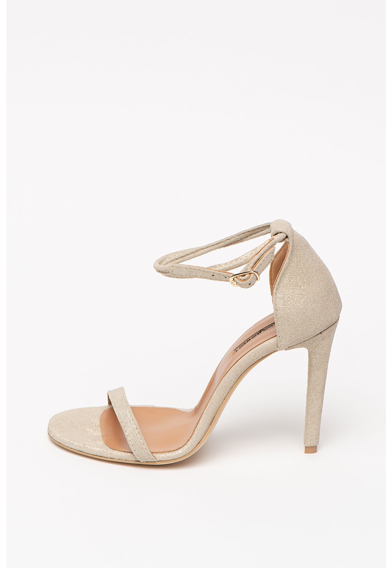 Caracteristici Tip: cu toc Culoare: auriu deschis Material: piele nabuc Stil: elegant Tip toc: stiletto Detalii: aspect stralucitor Sistem inchidere: catarama Compozitie Partea superioara: nabuc Material interior: piele Material talpa: alte materiale Dimensiuni Inaltime toc: 10 cm