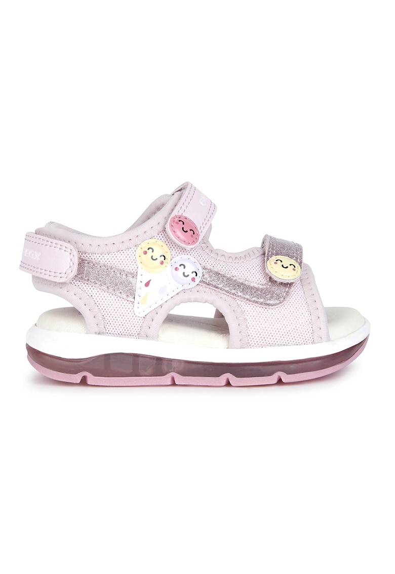 Caracteristici Culoare: roz pal Stil: casual Imprimeu: uni Material: textil – piele ecologica Varf: deschis Sistem inchidere: velcro Detalii: particule stralucitoare Compozitie Partea superioara: textil – alte materiale Material interior: piele Material talpa: alte materiale