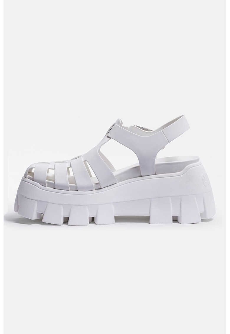 Caracteristici Tip: cu platforma Culoare: alb optic Material: piele ecologica Stil: casual Tip toc: masiv Sistem inchidere: catarama Compozitie Partea superioara: alte materiale Material interior: alte materiale Material talpa: alte materiale Dimensiuni Platforma fata: 5 cm Platforma spate: 8 cm