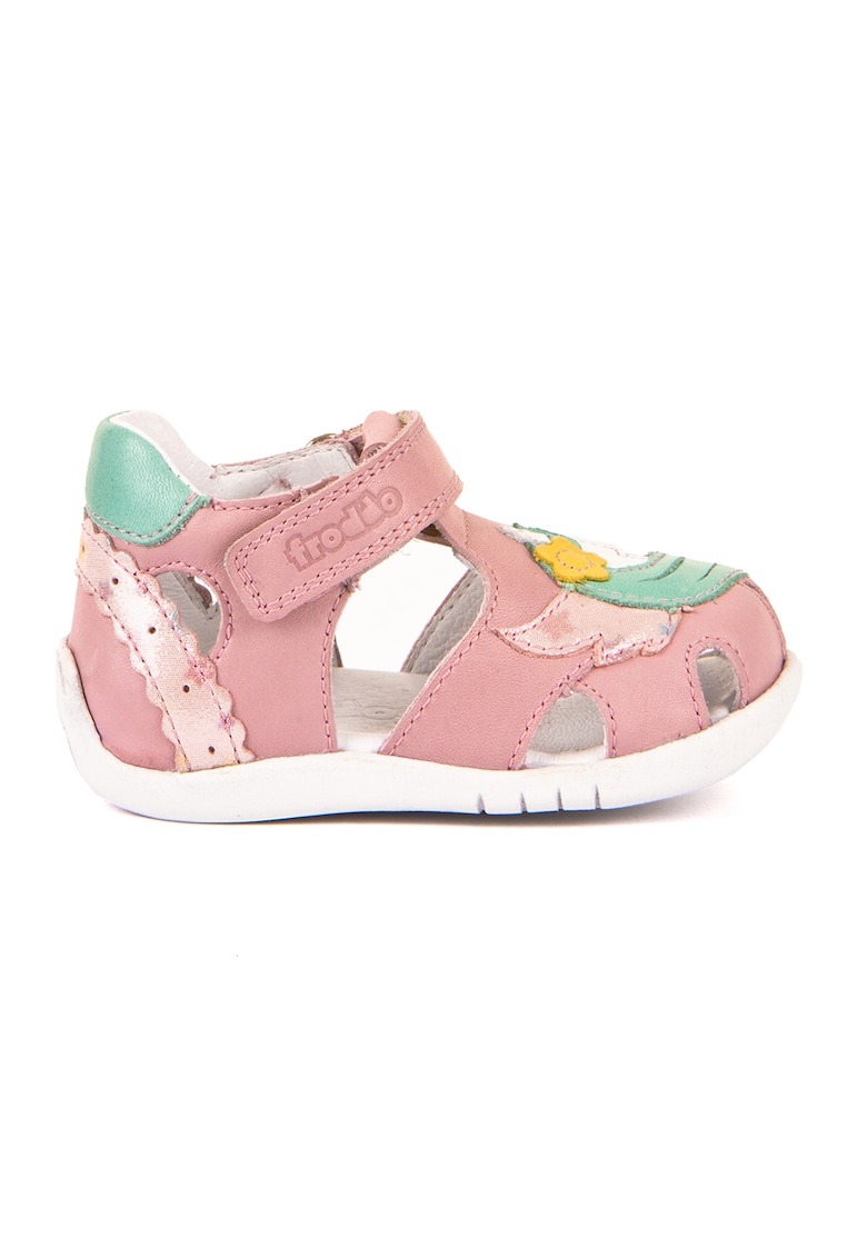 Caracteristici Culoare: roz pastel – verde deschis Imprimeu: uni Material: piele naturala Sistem inchidere: velcro Tip talpa: plata Detalii: aplicatie cu unicorn Compozitie Partea superioara: piele Material interior: piele naturala Material talpa: alte materiale