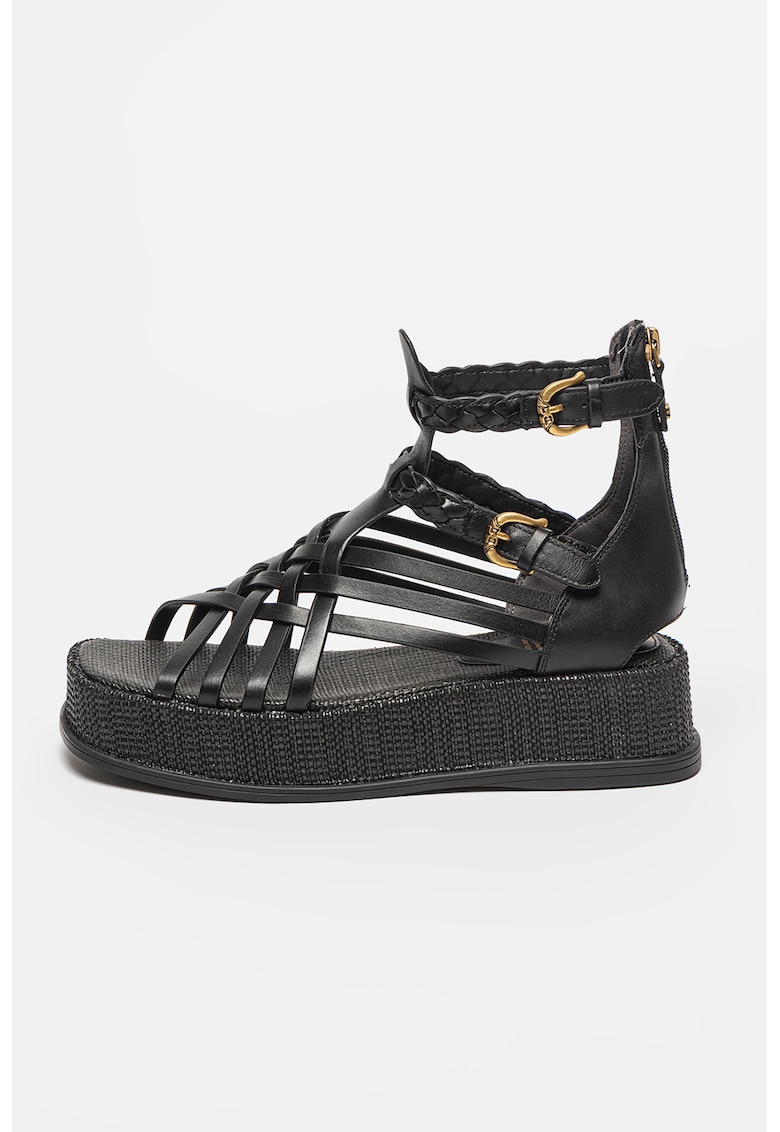 Caracteristici Tip: cu talpa joasa Culoare: negru Material: piele naturala Imprimeu: uni Stil: casual Tip talpa: plata Culoare elemente metalice: auriu Detalii: aspect impletit – design cu barete multiple Sistem inchidere: catarama – fermoar Compozitie Partea superioara: piele Material interior: sintetic Material talpa: alte materiale