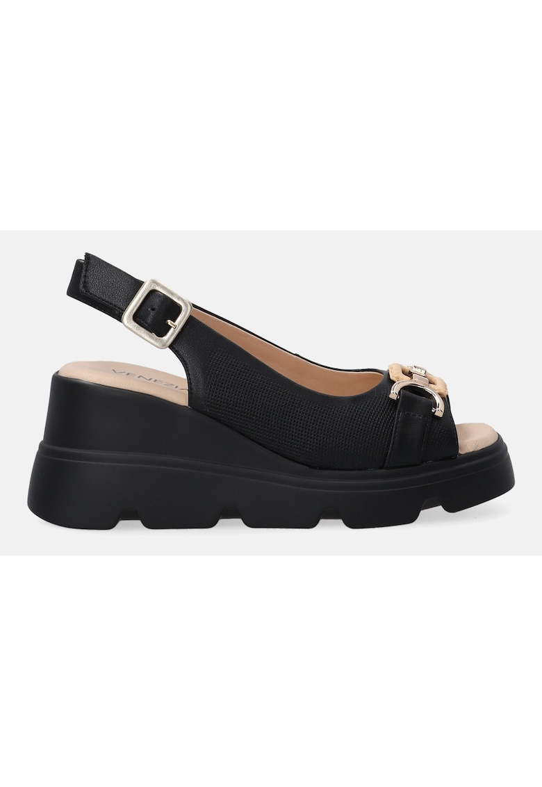 Caracteristici Tip: cu platforma Culoare: negru Material: piele naturala Imprimeu: uni Stil: casual Tip talpa: wedge Culoare elemente metalice: auriu Sistem inchidere: catarama Compozitie Partea superioara: piele Material interior: textil Material talpa: 100% sintetic Dimensiuni Platforma spate: 7 cm