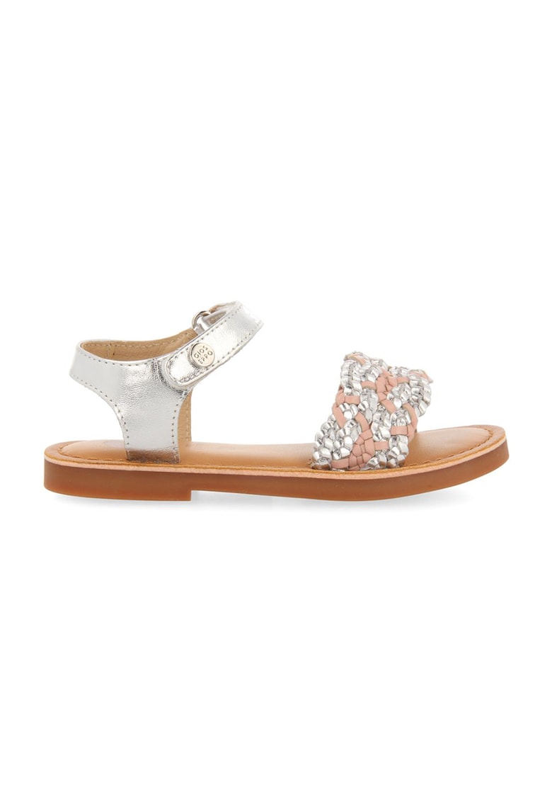 Caracteristici Culoare: argintiu Stil: casual Imprimeu: uni Material: piele naturala Varf: deschis Sistem inchidere: velcro Tip talpa: plata Detalii: detalii metalizate – barete cu aspect impletit Compozitie Partea superioara: piele Material interior: piele Material talpa: alte materiale