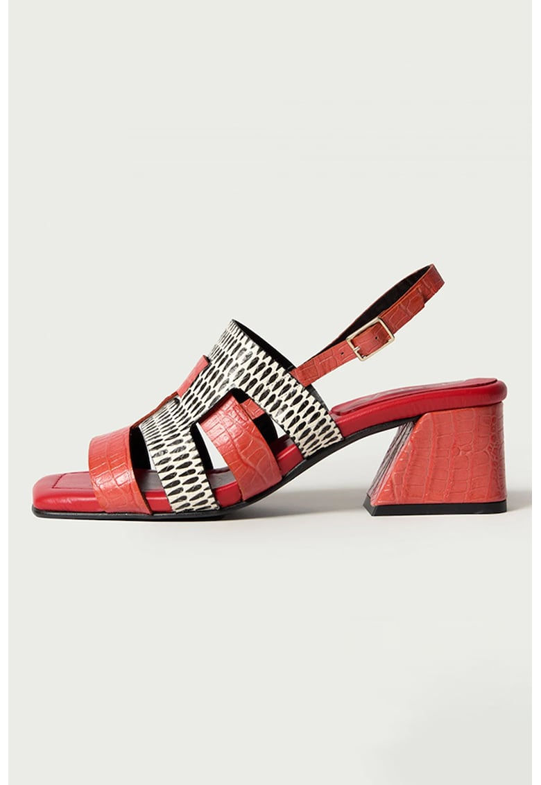 Caracteristici Tip: cu toc Culoare: rosu – negru – alb Material: piele naturala Imprimeu: cu model Stil: elegant Tip toc: masiv Culoare elemente metalice: auriu Detalii: model crocodil Sistem inchidere: catarama Compozitie Partea superioara: piele Material interior: piele Material talpa: alte materiale Dimensiuni Inaltime toc: 6 cm