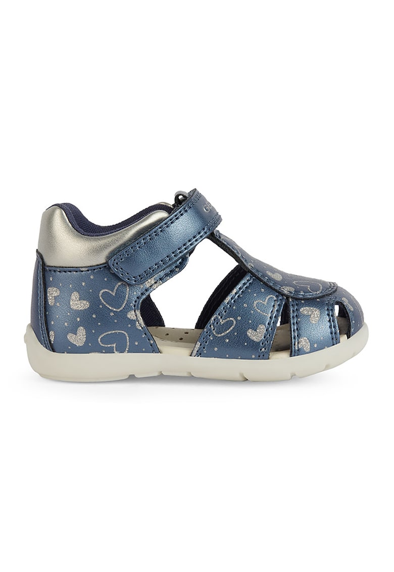 Caracteristici Culoare: albastru – argintiu Imprimeu: grafic Material: piele ecologica Sistem inchidere: velcro Tip talpa: plata Compozitie Partea superioara: alte materiale Material interior: textil Material talpa: alte materiale