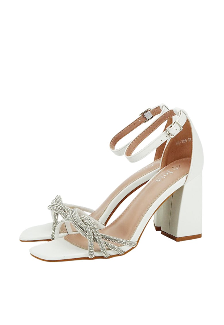 Caracteristici Culoare: alb Material: piele ecologica Imprimeu: uni Stil: elegant Varf: patrat Culoare elemente metalice: argintiu Sistem inchidere: catarama Dimensiuni Inaltime toc: 8.5 cm