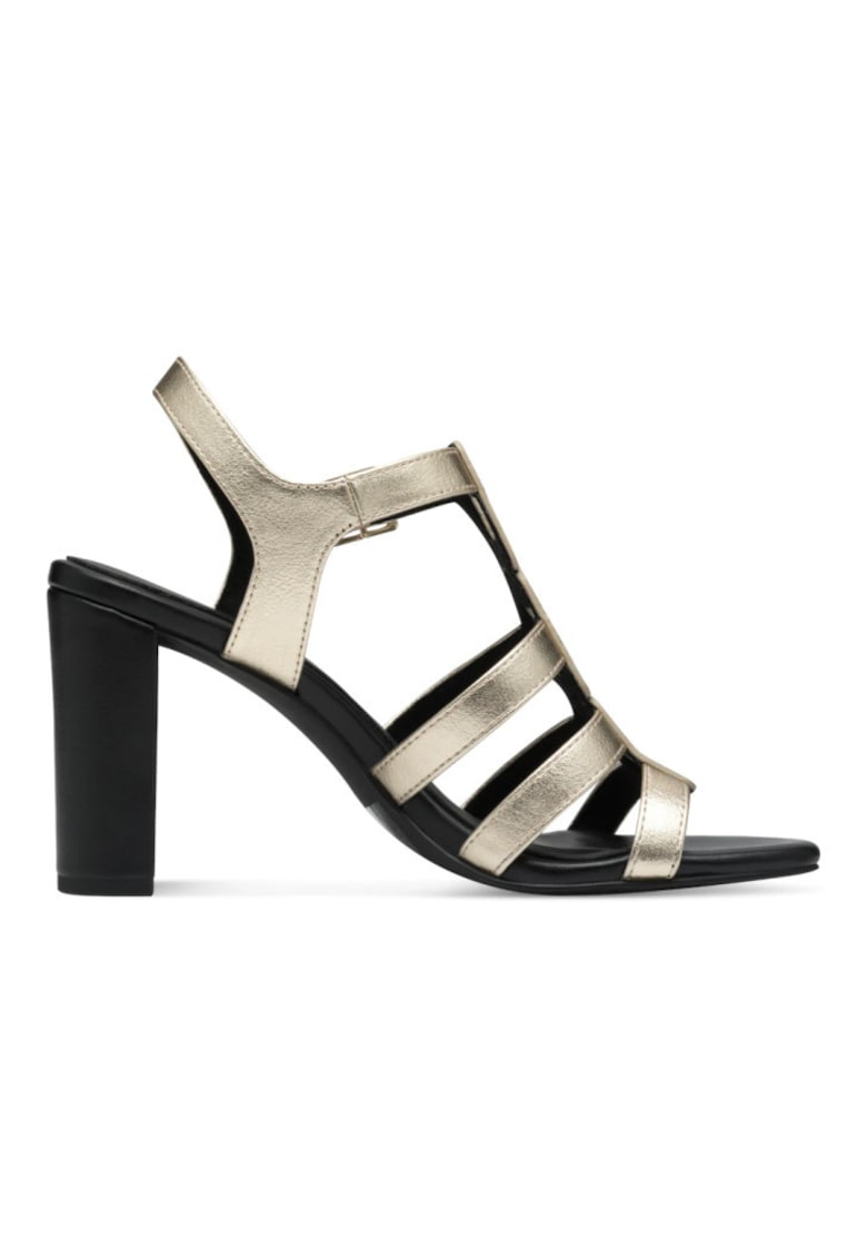 Caracteristici Tip: cu toc Culoare: auriu Material: piele ecologica Stil: elegant Tip toc: masiv Tehnologie: feel me Sistem inchidere: catarama Dimensiuni Inaltime toc: 9 cm