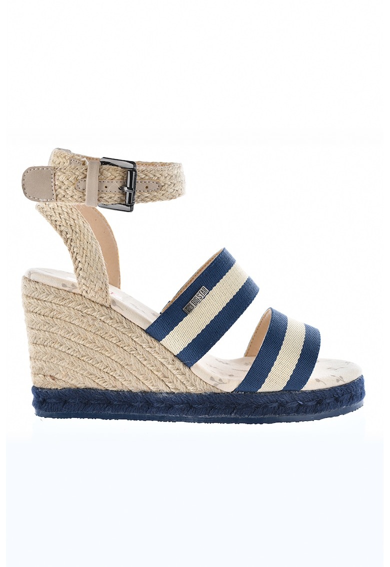 Caracteristici Tip: cu platforma Culoare: bej – bleumarin Material: textil Imprimeu: cu model Stil: casual Varf: rotund Tip talpa: flatform Sistem inchidere: catarama Compozitie Partea superioara: material textil Material interior: textil Material talpa: alte materiale Dimensiuni Platforma spate: 8 cm