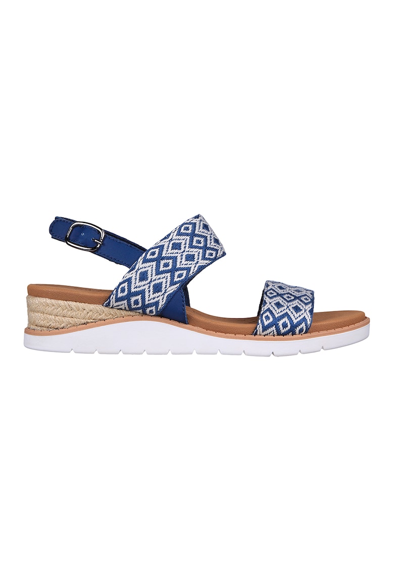 Caracteristici Tip: cu platforma Culoare: gri deschis – bleumarin Material: textil – piele ecologica Imprimeu: cu model Stil: casual Varf: rotund Tip talpa: wedge Tehnologie: plush foam Detalii: bareta slingback ajustabila Sistem inchidere: catarama Compozitie Partea superioara: textil – alte materiale Material interior: alte materiale Material talpa: alte materiale Dimensiuni Platforma spate: 3 cm