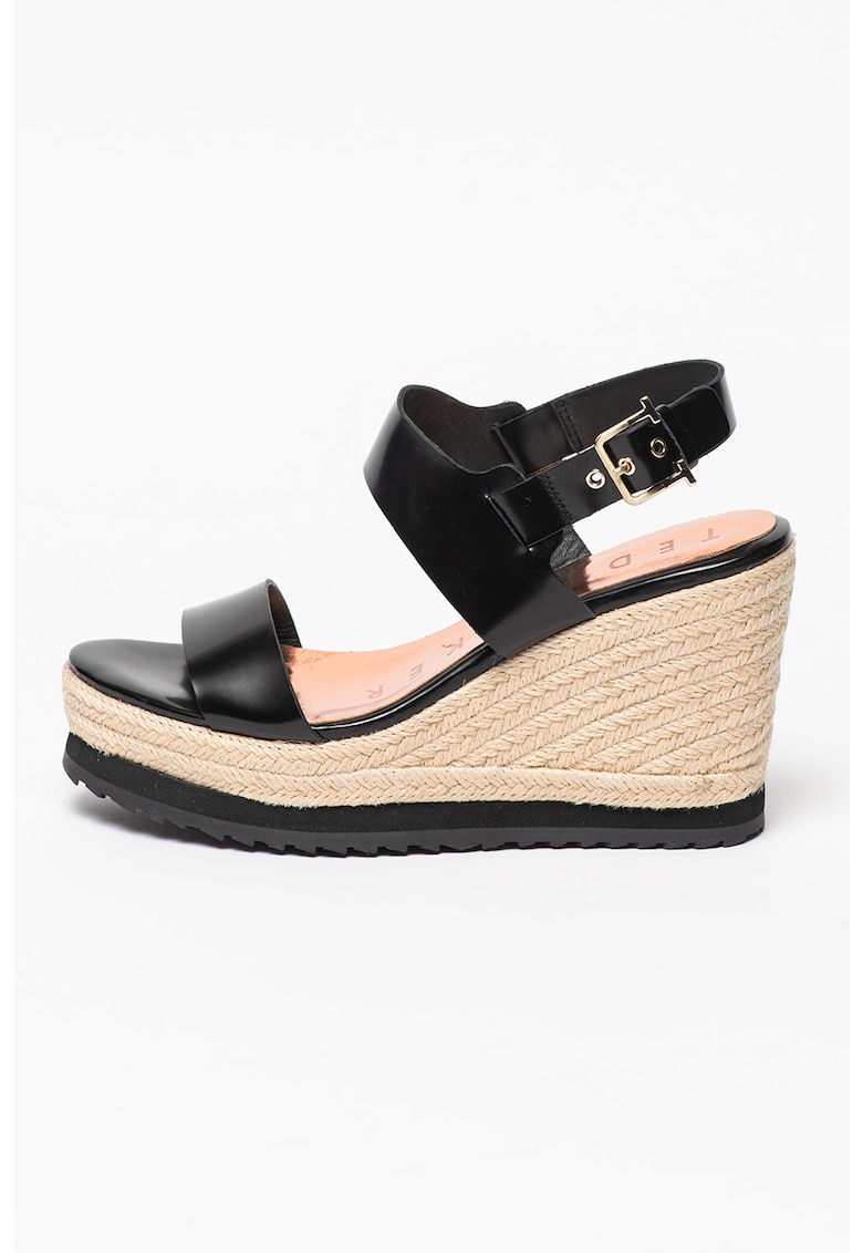 Caracteristici Tip: cu platforma Culoare: negru Material: piele naturala Stil: casual Varf: rotund Tip talpa: wedge Culoare elemente metalice: auriu Detalii: talpa din iuta Sistem inchidere: catarama Compozitie Partea superioara: piele Material interior: piele Material talpa: alte materiale Dimensiuni Platforma spate: 8.5 cm