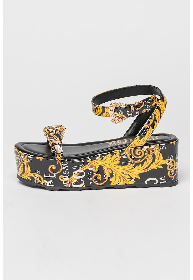 Caracteristici Tip: cu platforma Culoare: negru – alb – galben Material: piele ecologica Imprimeu: cu model Stil: casual Tip talpa: flatform Culoare elemente metalice: auriu Sistem inchidere: catarama Compozitie Partea superioara: alte materiale Material interior: alte materiale Material talpa: alte materiale Dimensiuni Inaltime talpa: 6 cm