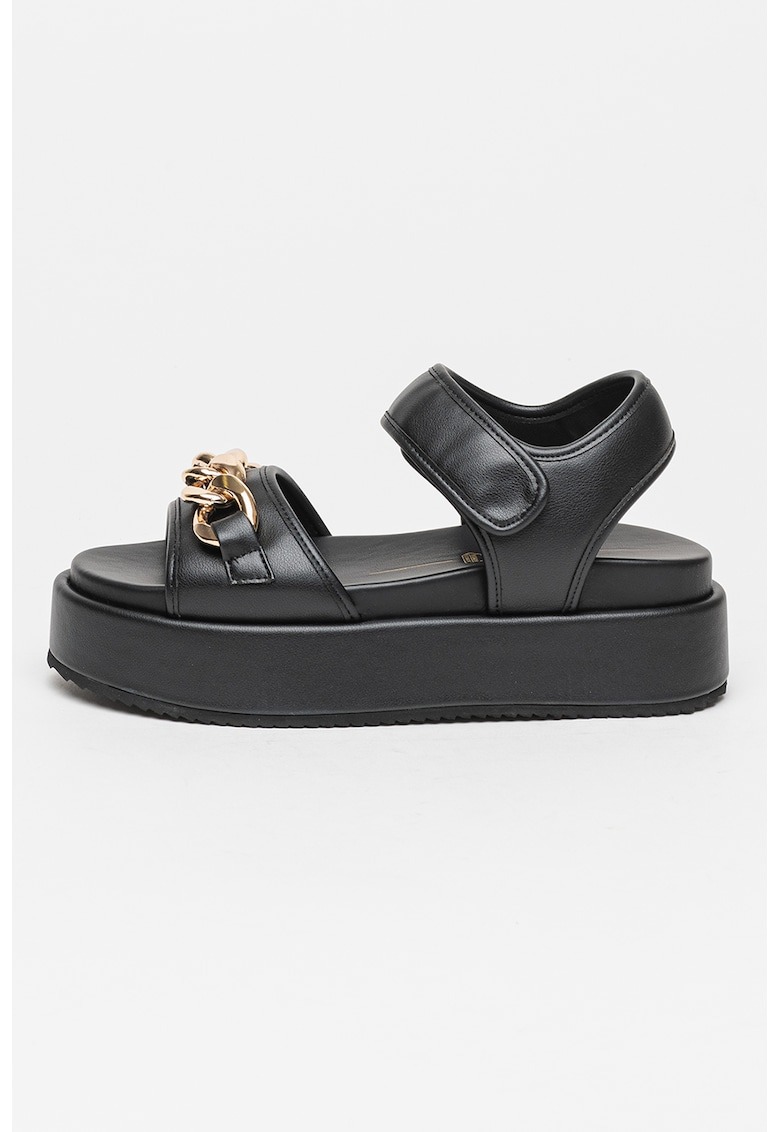 Caracteristici Tip: cu platforma Culoare: negru Material: piele ecologica Imprimeu: uni Stil: casual Tip talpa: flatform Culoare elemente metalice: auriu Detalii: detaliu din lant Sistem inchidere: velcro Compozitie Partea superioara: alte materiale Material interior: alte materiale Material talpa: alte materiale Dimensiuni Inaltime talpa: 6 cm