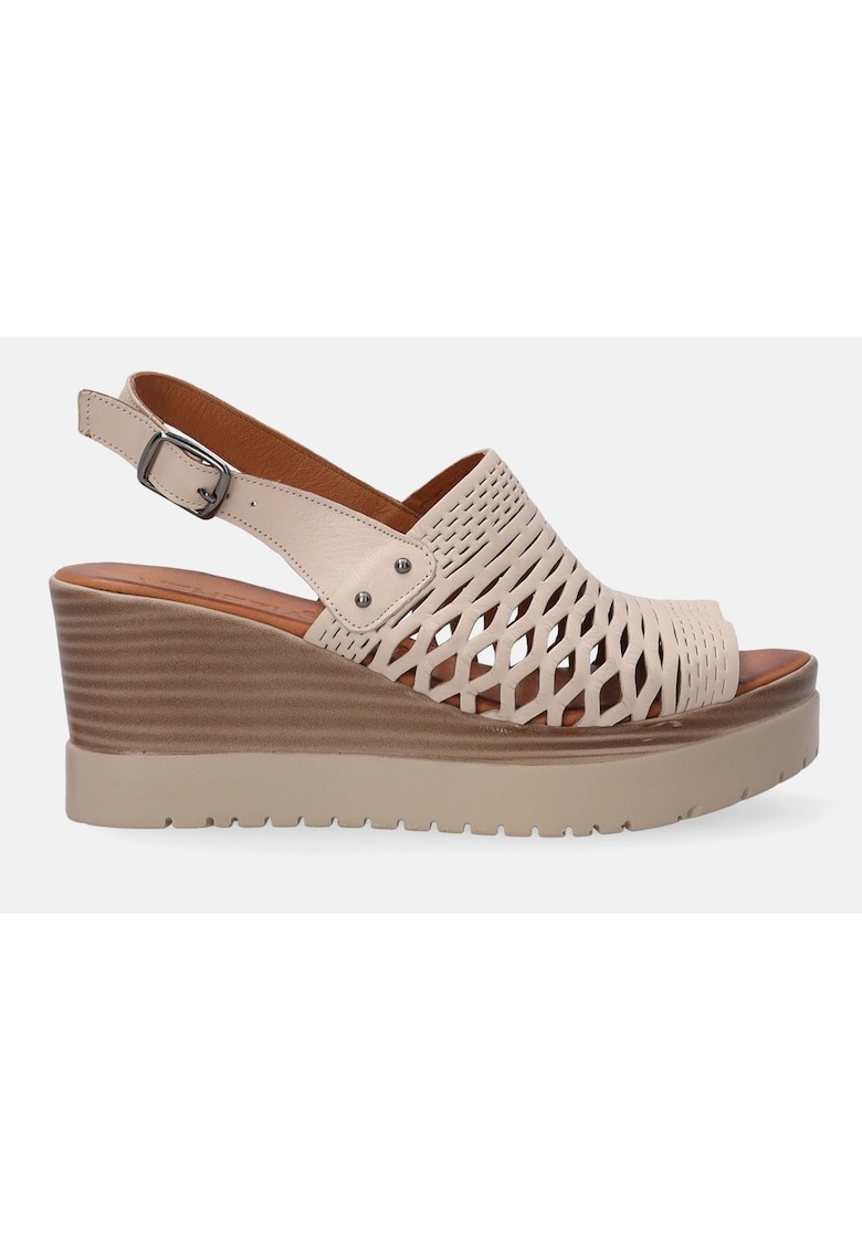 Caracteristici Culoare: bej Material: piele naturala Imprimeu: uni Stil: casual Tip talpa: wedge Culoare elemente metalice: argintiu Sistem inchidere: catarama Compozitie Partea superioara: piele Material interior: piele Material talpa: 100% sintetic Dimensiuni Inaltime toc: 7 cm