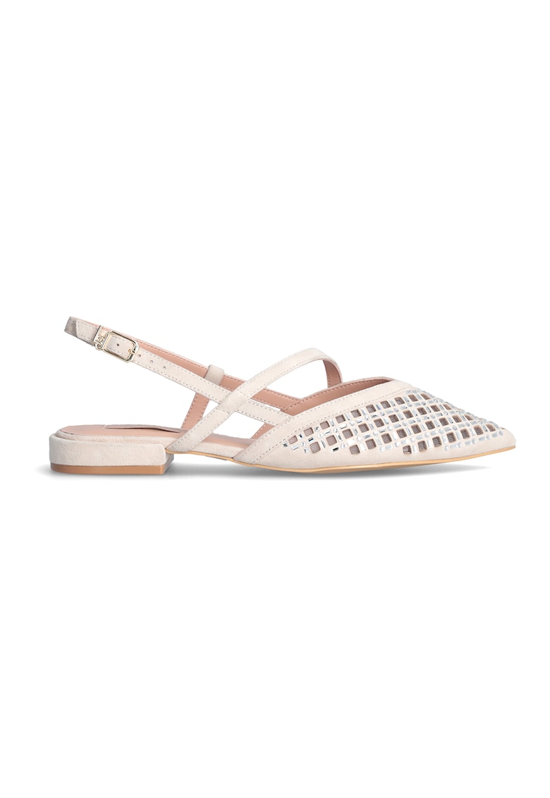 Caracteristici Culoare: bej Material: textil – piele intoarsa Imprimeu: uni Stil: elegant Varf: ascutit Tip talpa: plata Detalii: insertii de plasa – strasuri – design perforat – bareta slingback ajustabila Sistem inchidere: catarama Compozitie Partea superioara: textil – piele intoarsa Material interior: alte materiale – piele Material talpa: alte materiale Dimensiuni Inaltime toc: 2 cm