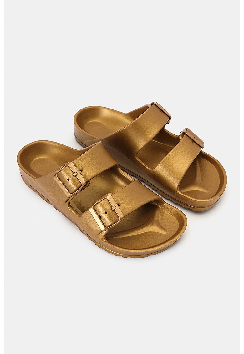 Caracteristici Tip produs: papuci Culoare: auriu Material: sintetic Stil: casual Varf: patrat Tip talpa: plata Detalii: aspect metalic Compozitie Partea superioara: alte materiale Material interior: alte materiale Material talpa: alte materiale