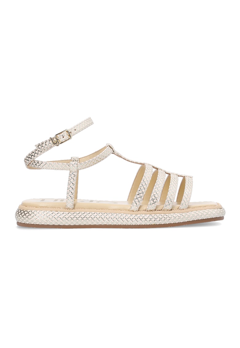 Caracteristici Tip: cu talpa joasa Culoare: argintiu – bej deschis Material: piele ecologica Imprimeu: uni Stil: casual Tip talpa: plata Culoare elemente metalice: auriu Detalii: aspect texturat – barete multiple Sistem inchidere: catarama Compozitie Partea superioara: alte materiale Material interior: alte materiale Material talpa: alte materiale