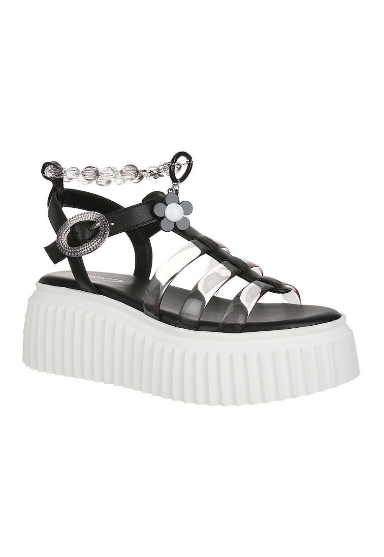 Caracteristici Tip: cu platforma Culoare: transparent – negru Material: sintetic – piele ecologica Imprimeu: uni Stil: casual Varf: rotund Tip talpa: wedge Detalii: bareta de margele detasabila Sistem inchidere: catarama Compozitie Partea superioara: alte materiale Material interior: alte materiale Material talpa: alte materiale Dimensiuni Platforma fata: 5 cm Platforma spate: 7 cm
