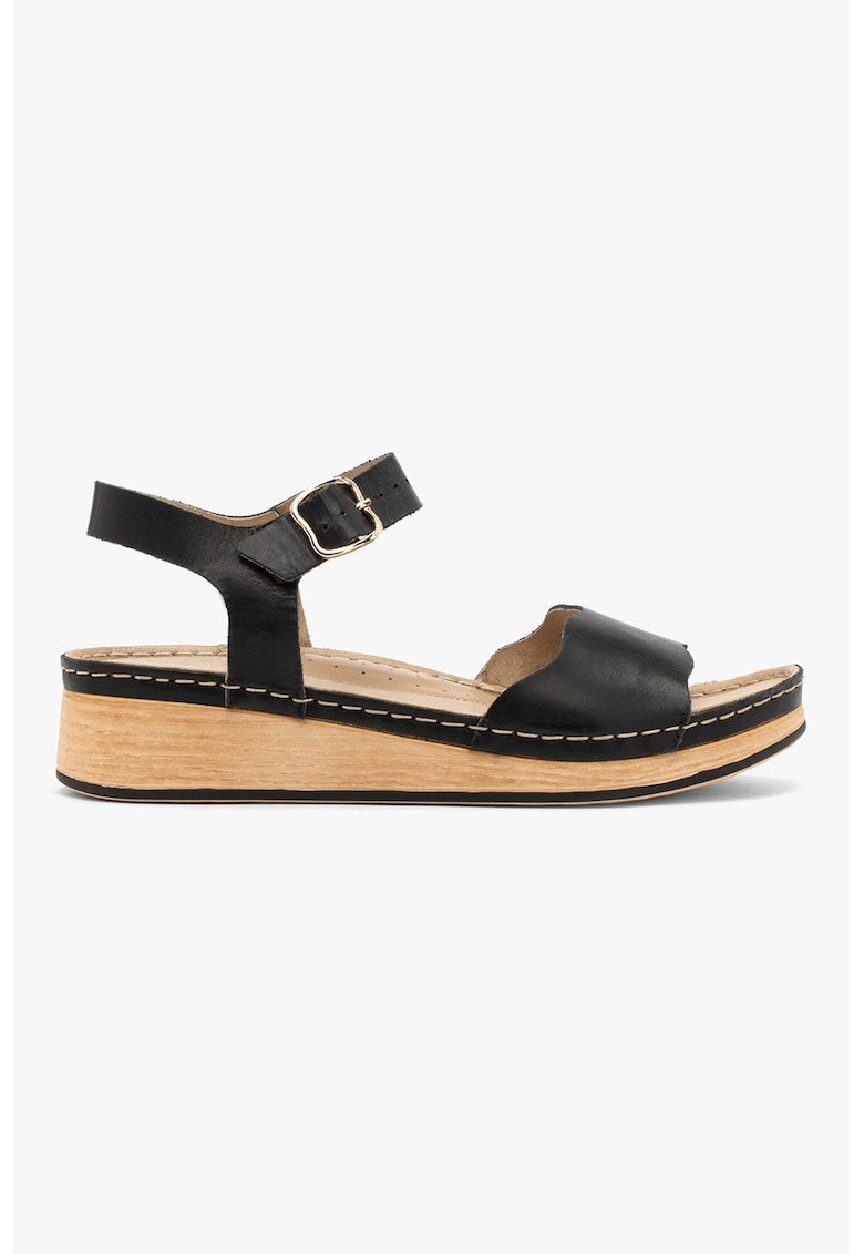 Caracteristici Tip: cu platforma Culoare: negru Material: piele naturala Imprimeu: uni Stil: casual Tip talpa: wedge Culoare elemente metalice: argintiu Sistem inchidere: catarama Compozitie Partea superioara: piele Material interior: piele Material talpa: alte materiale Dimensiuni Platforma spate: 3.5 cm